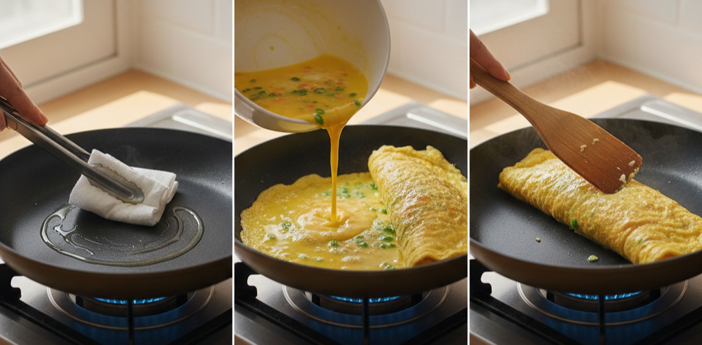 계란말이는 팬의 온도가 정말 중요해요. 팬이 너무 뜨거우면 계란이 순간적으로 익어버려 말아올릴 틈이 없고, 너무 차갑다면 계란이 팬에 들러붙으며 부서집니다. 중약불에서 아주 천천히 익히는 것이 계란말이를 가장 부드럽게 만드는 핵심입니다. 또 다른 비법은 계란물을 팬에 부을 때 한 번에 붓지 않고 세 번에 나누어 붓는 것이에요. 이렇게 하면 형태가 단단해지고 말아올릴 때 터지지 않아 깔끔한 모양이 나옵니다.