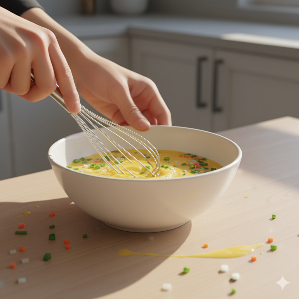 계란말이의 맛과 식감은 재료의 크기에서 시작됩니다. 대파는 아주 잘게 다져야 계란이 고르게 섞이고 모양이 단정하게 나와요. 당근은 너무 많이 넣으면 식감이 거칠어지기 때문에 곱게 다지고 소량만 넣는 것을 추천합니다. 양파도 다질수록 좋아요. 거칠게 썰면 익으면서 물이 나와 계란말이가 풀어지는 원인이 됩니다. 계란을 풀 때는 젓가락보다 거품기를 사용하면 훨씬 균일한 계란물 질감을 만들 수 있어요. 단, 과하게 거품을 내면 구울 때 기포가 생기니 부드럽게 섞어주는 것이 포인트예요.