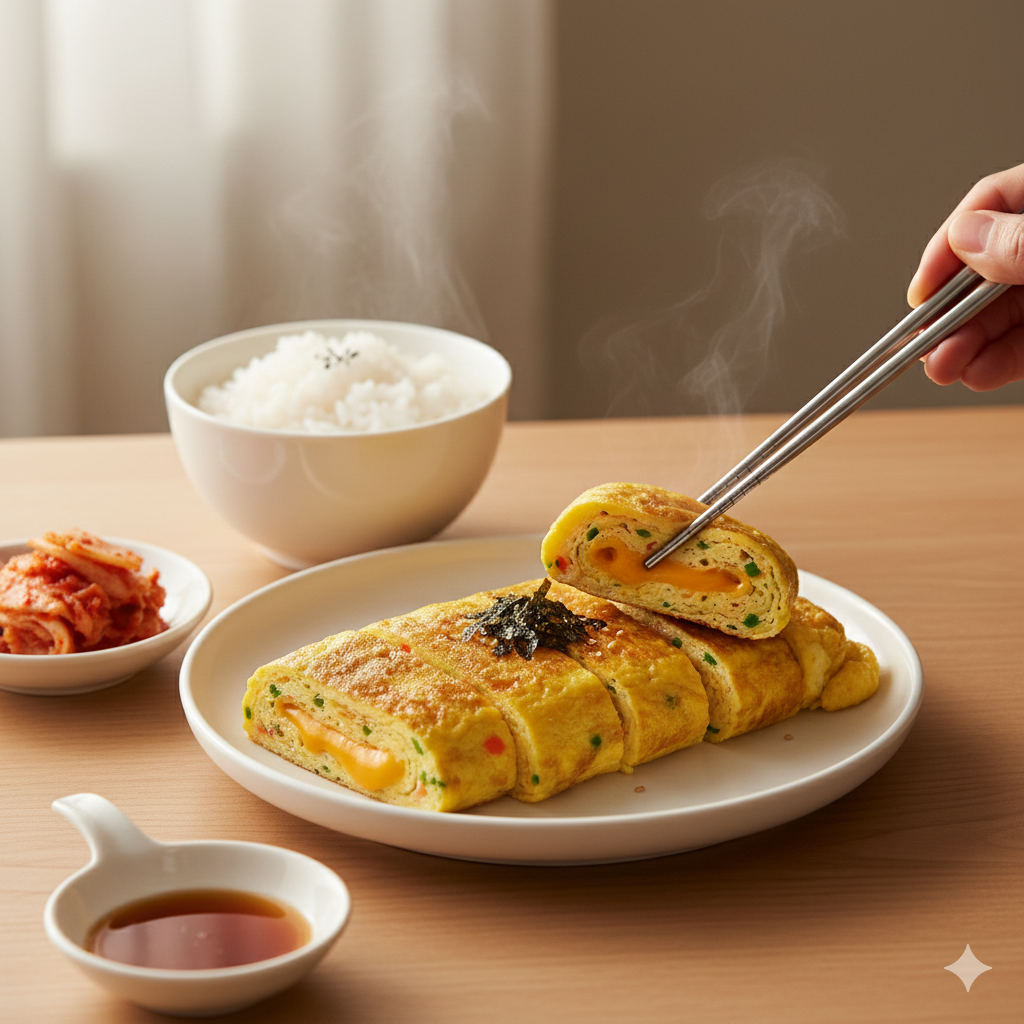 Korean Rolled Omelette is a soft, fluffy dish made by slowly cooking beaten eggs with finely chopped vegetables. The key is maintaining medium-low heat and pouring the egg mixture in three separate layers to build a thick, stable roll. Avoid creating too much foam when whisking the eggs and chop the vegetables very finely for a smooth texture. Perfect for lunchboxes, side dishes, and various home meals, it stays delicious even when cooled. Serve with a light soy dipping sauce for extra umami.