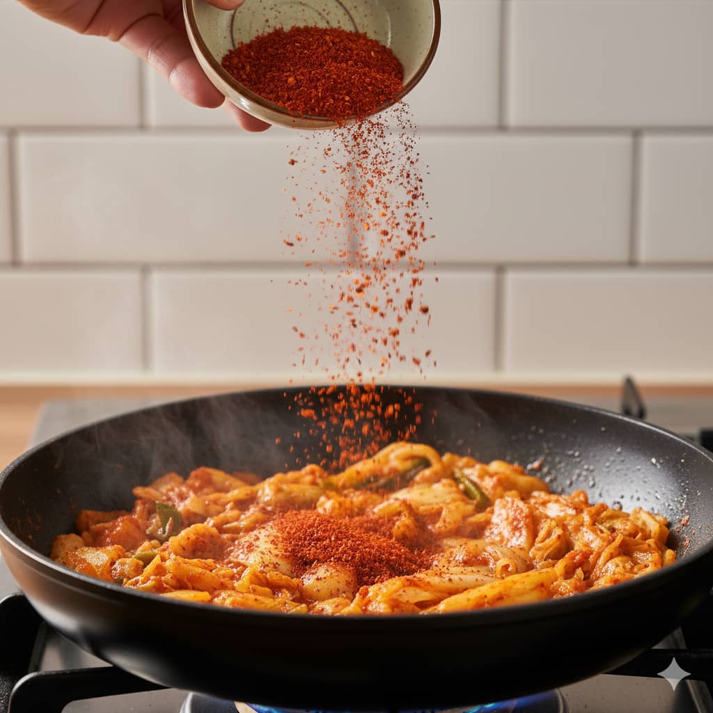 5. 고춧가루를 넣어 색감을 살리고 톡톡한 매운맛을 올립니다.
