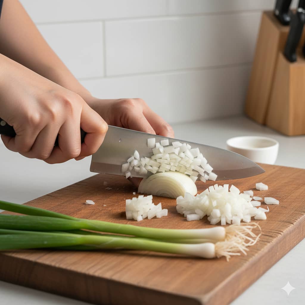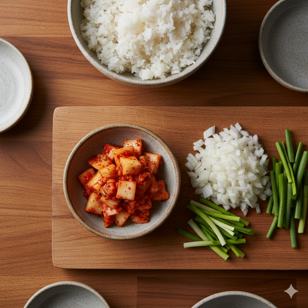 김치볶음밥의 핵심은 김치입니다. 너무 오래된 김치는 신맛이 강해서 설탕을 조금 넣어 균형을 맞추고, 신맛이 약한 김치는 국물까지 사용해 풍미를 끌어올리면 좋아요. 김치는 가위로 자르면 편하고, 너무 잘게 자르지 말고 먹는 식감이 살도록 1cm 정도 크기를 유지하는 게 좋아요. 파와 양파는 자연스러운 식감이 남도록 너무 잘게 다지지 말고 굵게 썰거나 짧게 다져주면 풍미가 좋아집니다. 밥은 고슬고슬해야 눌러붙지 않고 볶을 때 퍼지지 않아요. 전날 밥 또는 냉동밥을 추천합니다.
