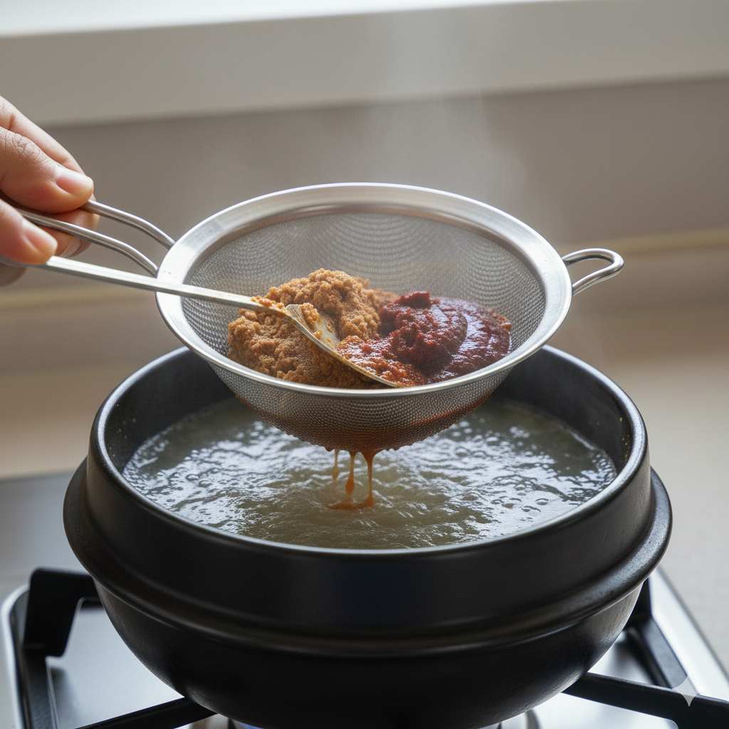 - 육수가 미지근할 때 된장 2스푼과 고추장 0.5스푼을 체에 풀어 넣습니다.
