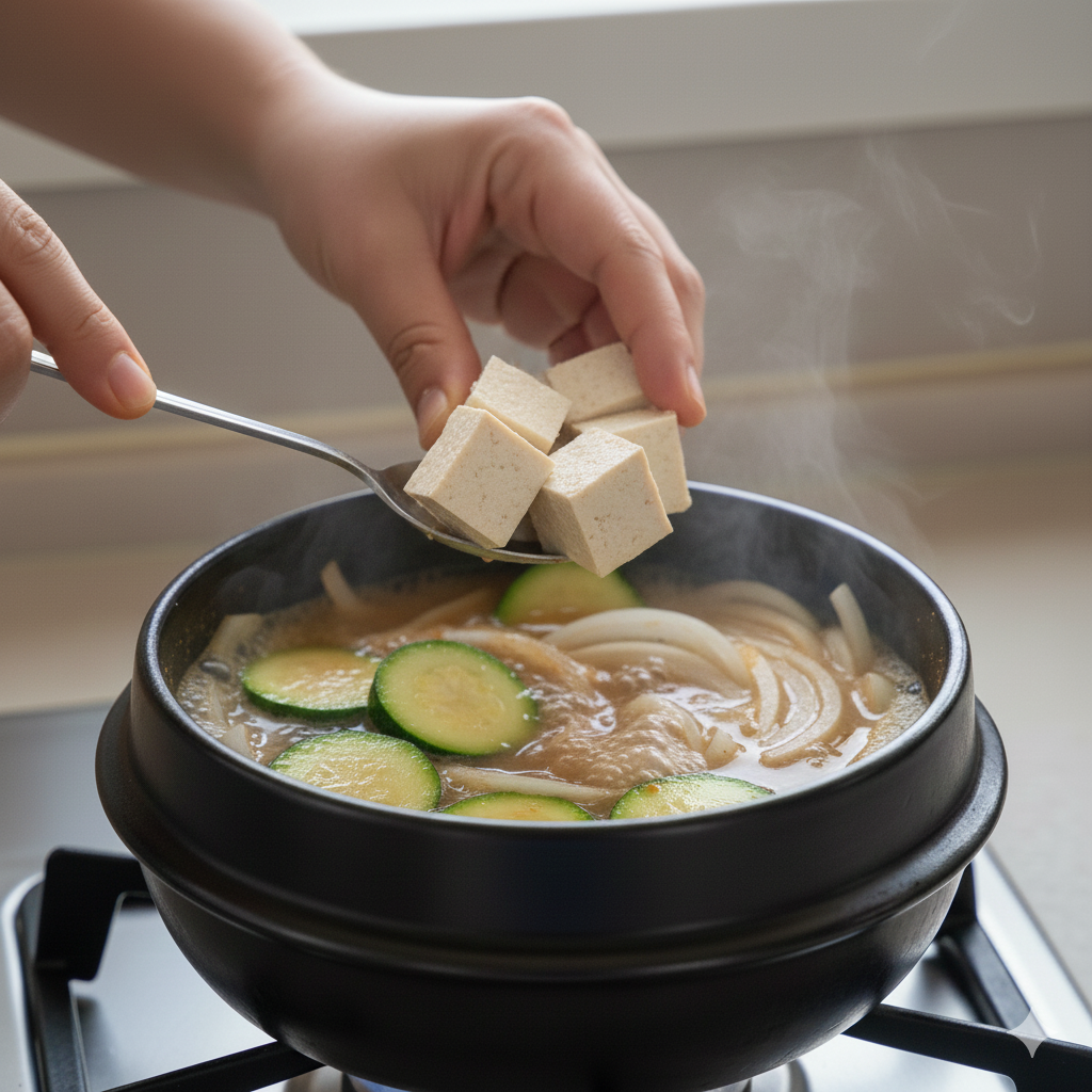 된장을 바로 육수에 풀지 않고 끓기 전 단계에서 풀어주는 것이 중요해요. 육수가 팔팔 끓은 뒤 된장을 넣으면 향이 날아가고 텁텁해질 수 있습니다.