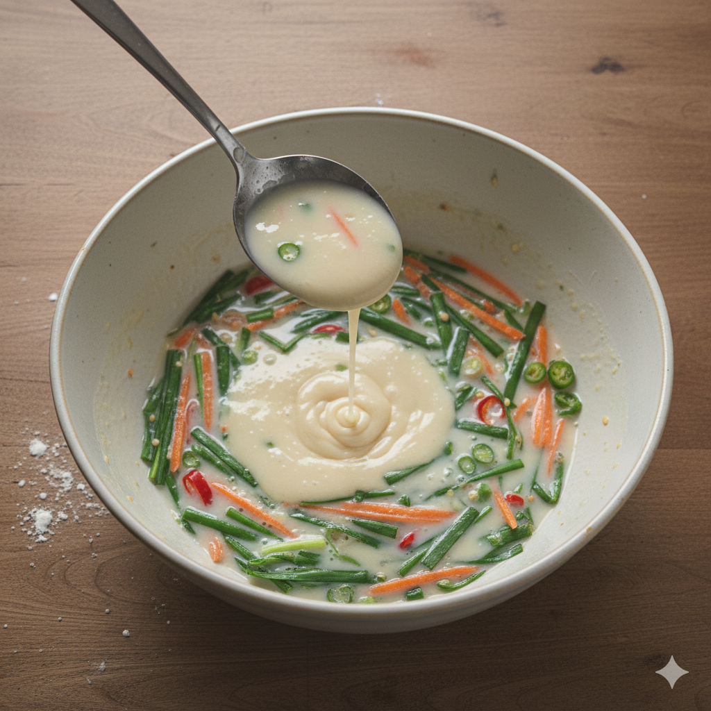- Add all vegetables into the batter and fold gently until evenly coated.
