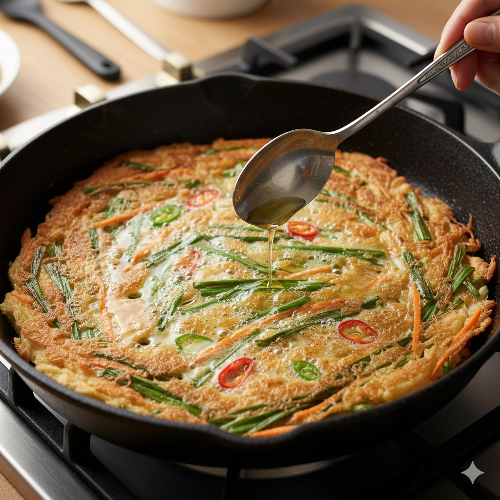 - 반대쪽도 노릇노릇하게 구워지면 불을 조금 줄이고, 사이사이 기름을 수저로 떠서 가장자리에도 다시 한 번 뿌려주면 전체가 고르게 바삭해져요.