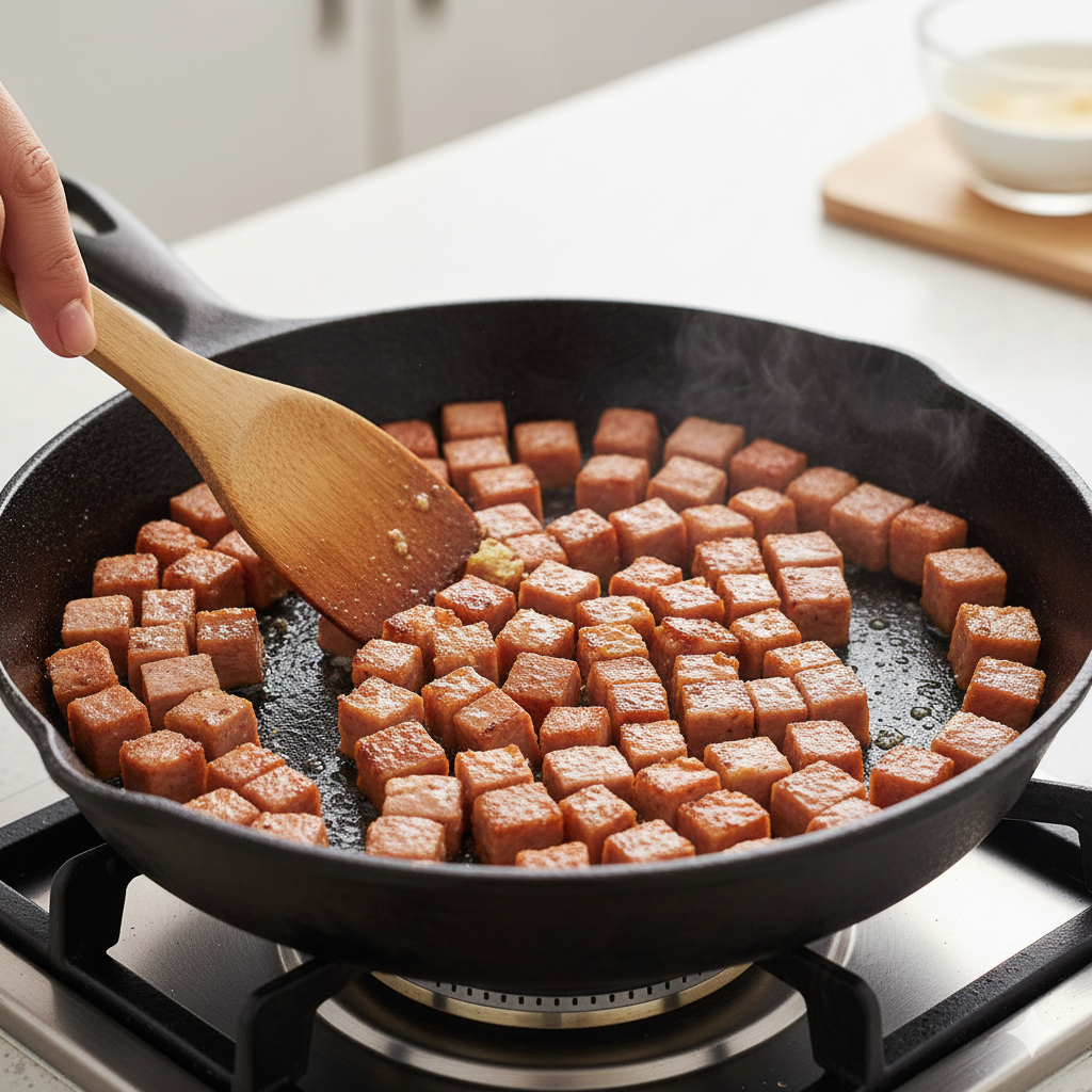 - Pan-fry diced spam until golden and crispy.