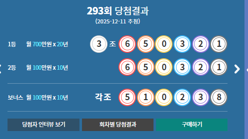 2025년 12월 11일, 제293회 연금복권 당첨번호 및 1, 2등 보너스 당첨 배출점 안내